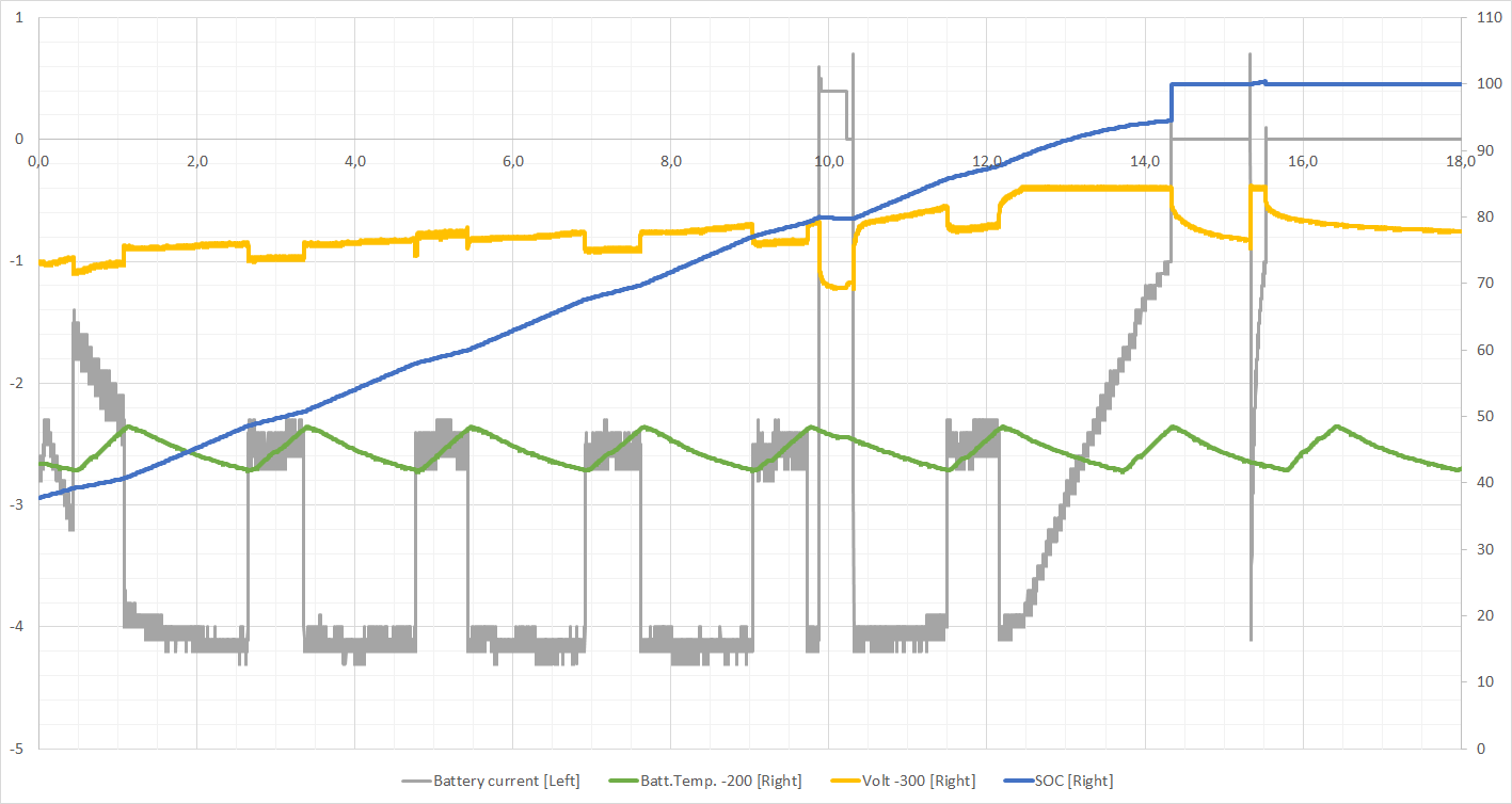 To ease the reading of the graph: the battery current is between 0A and -4.2A, SOC is between 40% and 100%, battery temperature 240C and 250C, battery voltage 369V and 384V.
