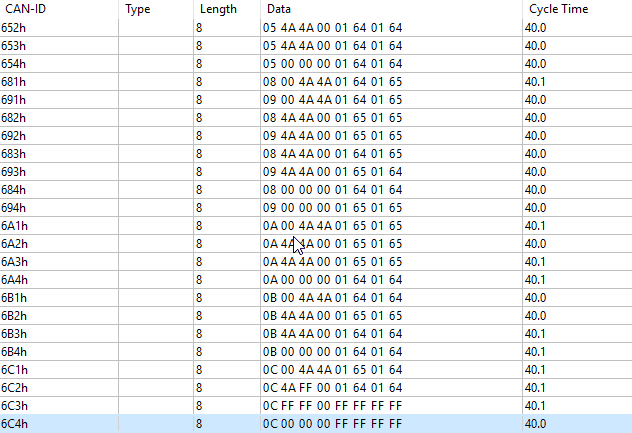 Two of the modules have only 4 cells each and the corresponding messages contain 00 or FF. See the screenshot below for messages 0x6C3 and 0x6C4.