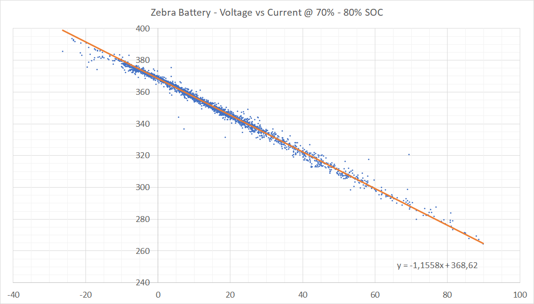 A graph showing the voltage vs current for a two drives at different SOC with Zebra battery in a Think A306.